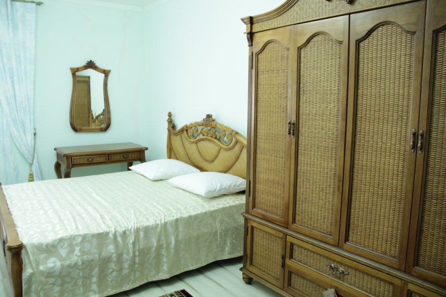 В спальной зоне имеется большая двуспальная кровать из высококачественной мебели «Ротанг» и прикроватные тумбочки, ортопедический матрас.